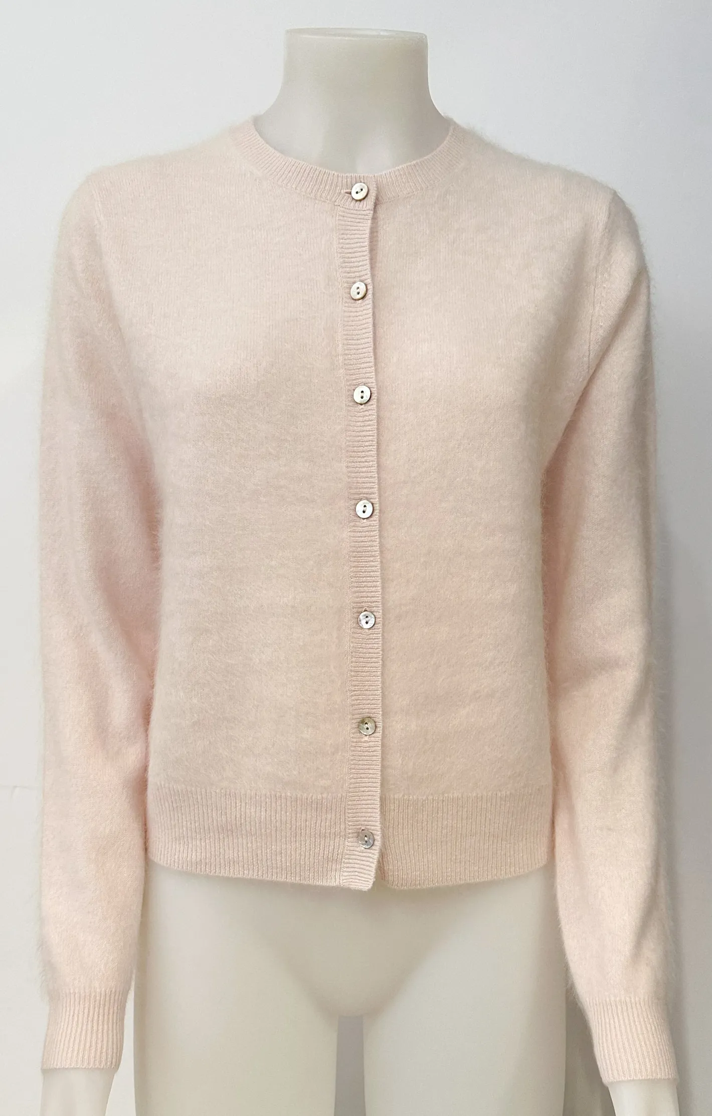 kleiner Cardigan mit Rundhals Ausschnittfeine Ripp Bündchengebürstetes CashmereFarbe White Sand / Light Rosé100% Cash…