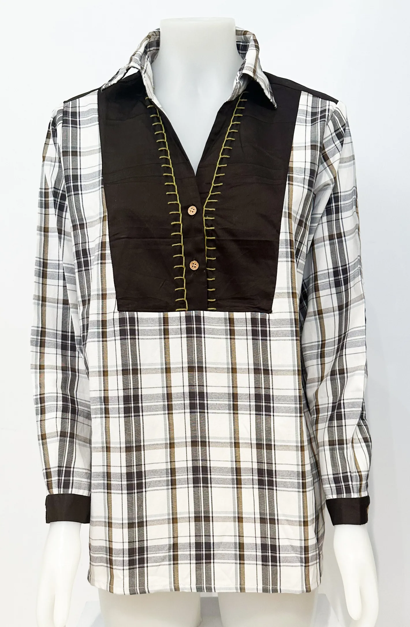 Tunikaformweit schwingendmit HemdbliusenkragenManschettenärmelPatch mit HandstickereiPatch am EllenbogenOnesizeBaumwoll…