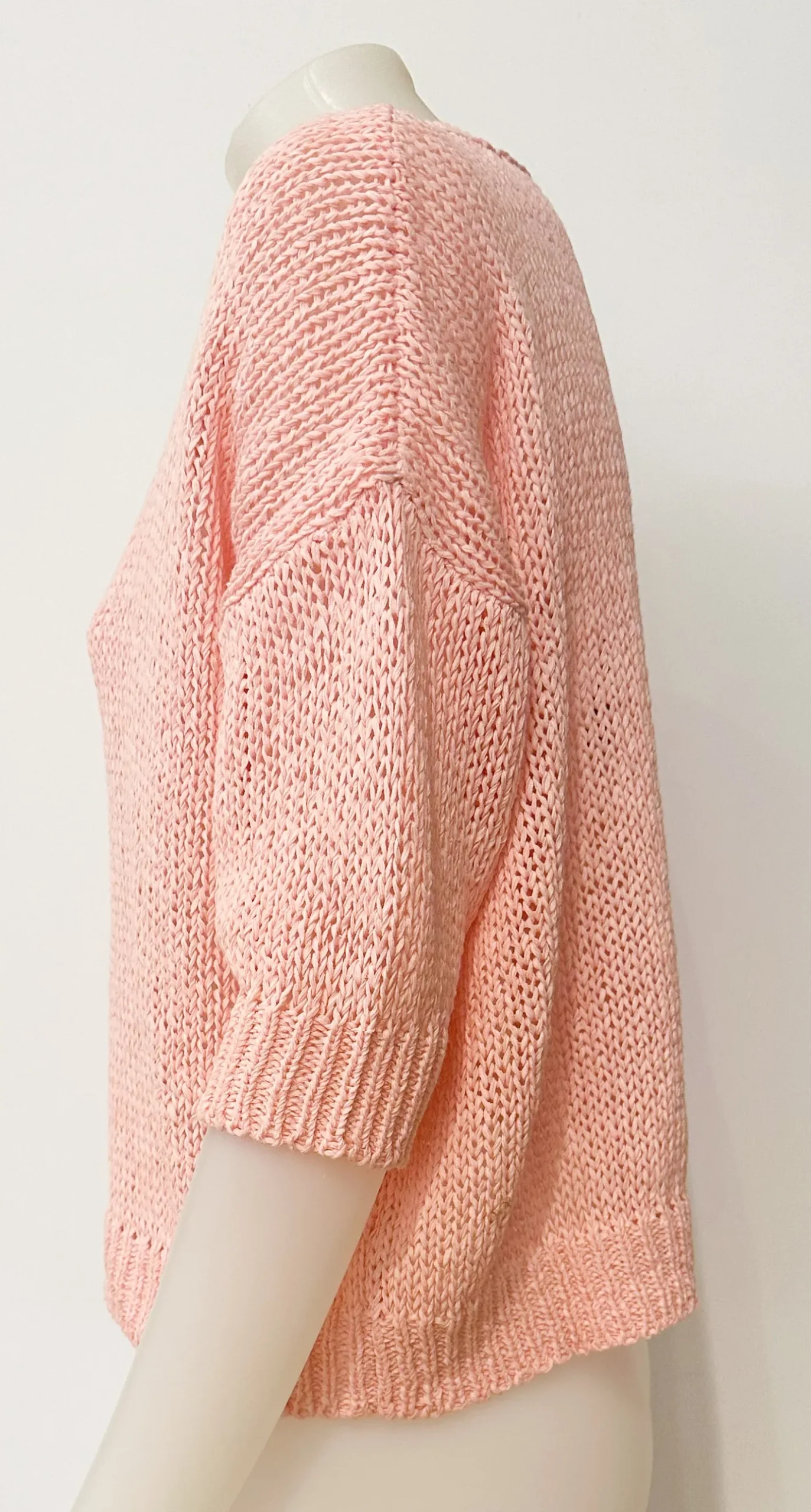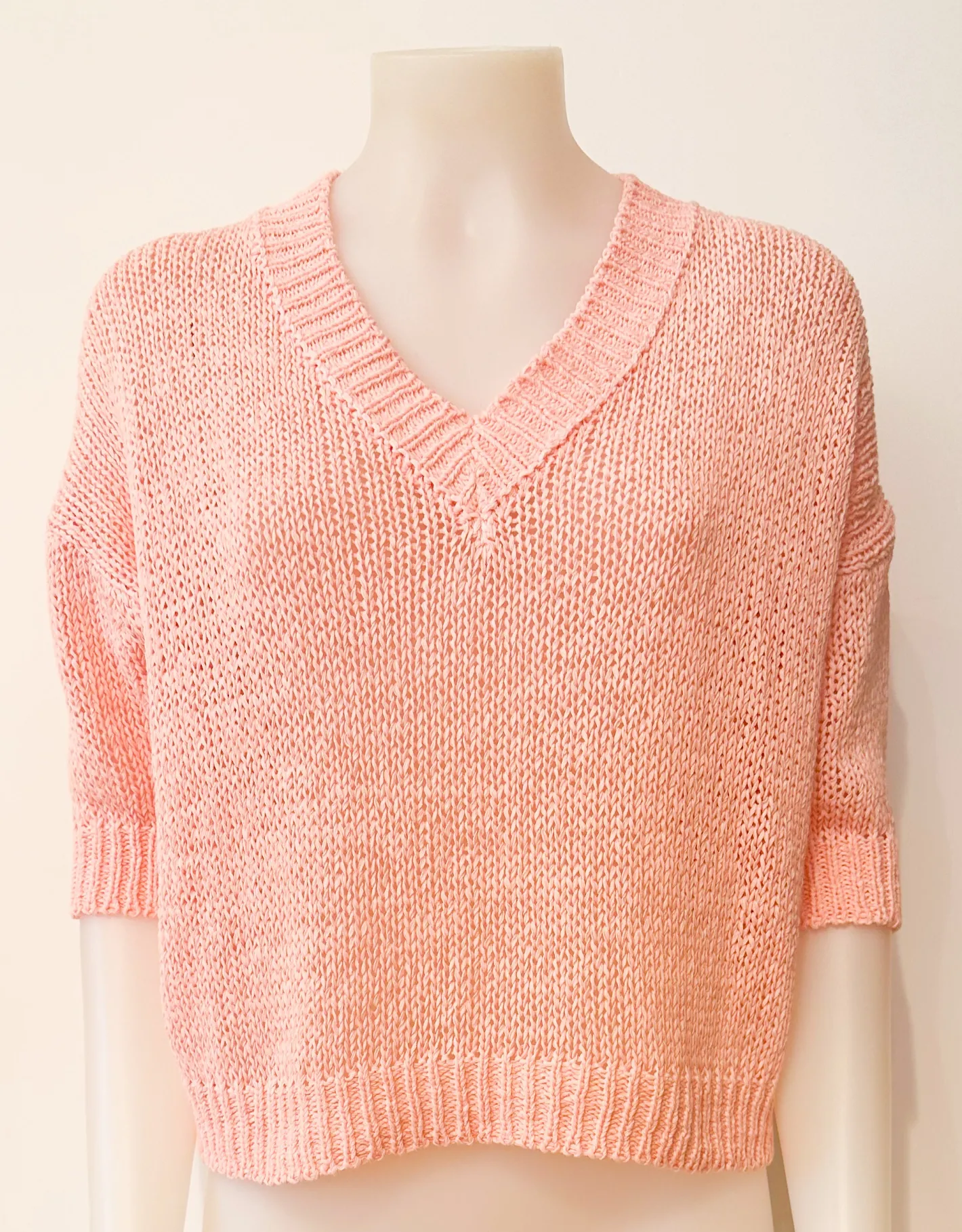 Boxy V-Neckloose FitRipp Bündchen3/4 ArmSommer StrickFarbe Rosa66% Baumwolle 34% Polyamid