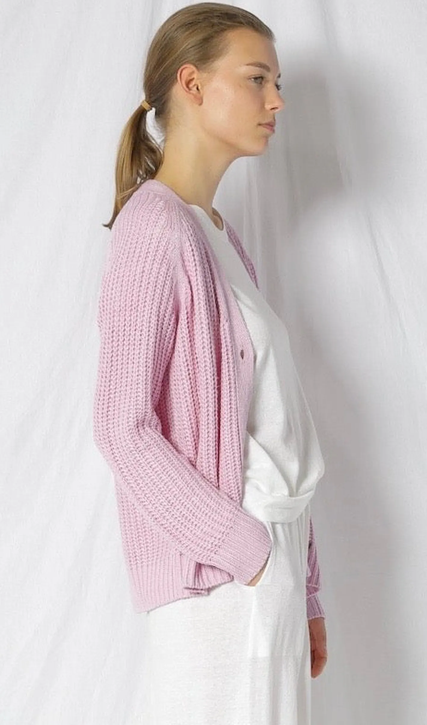 loose fitgerade geschnittenV-AusschnittKnopfleisteRipp BündchenFarbe Blossom100% Tussah Seide