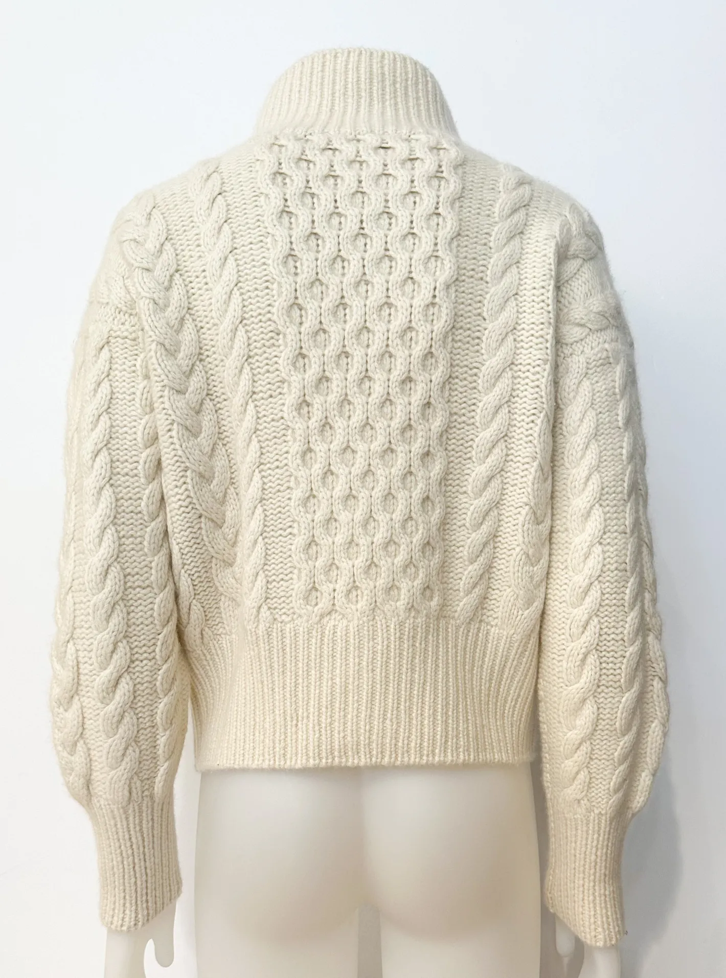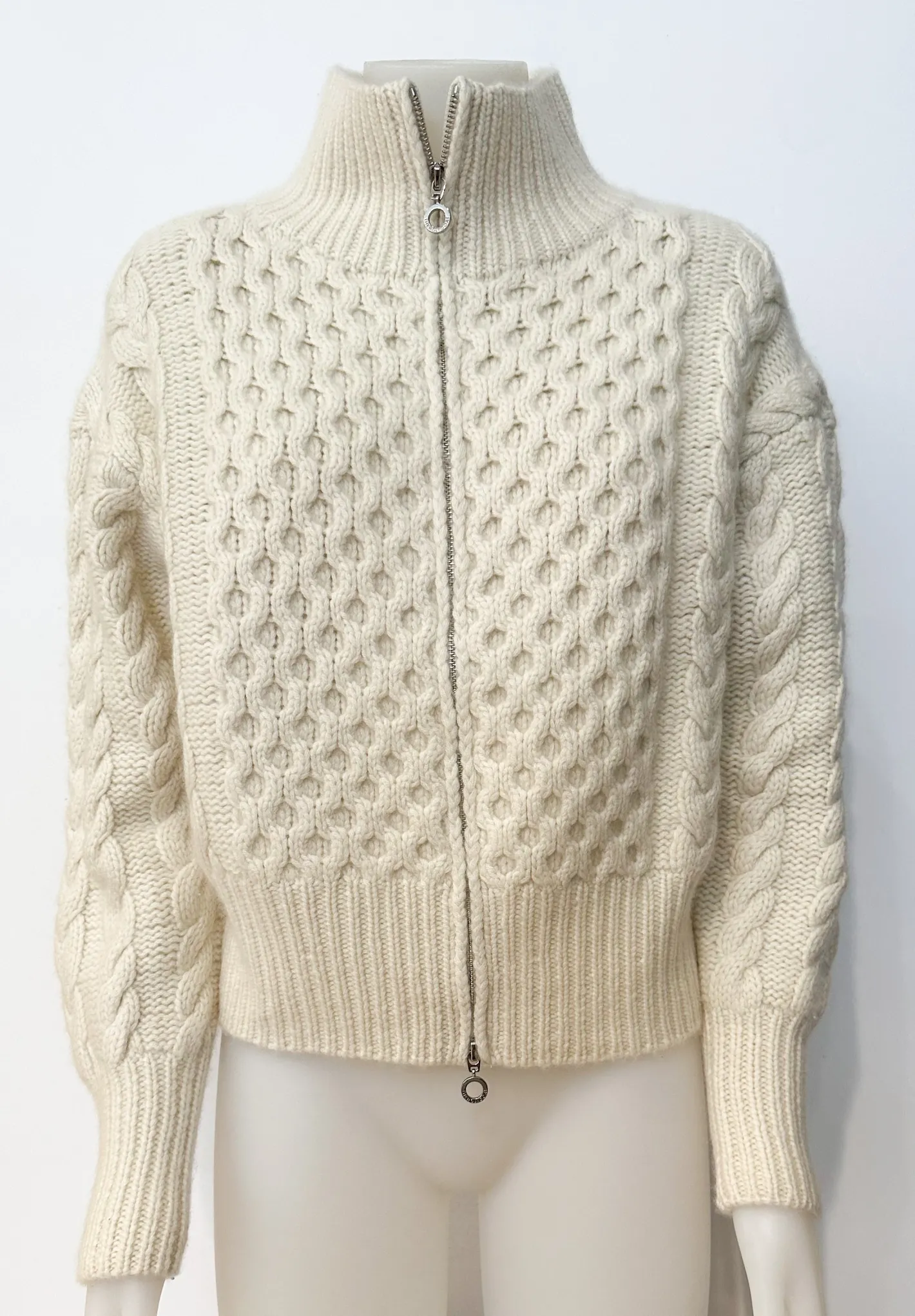 Bomber Stil2-Wege ReißverschlussStehkragen Rippehohe Ripp BündchenHandstrickFarbe Off-White100% Cashmere