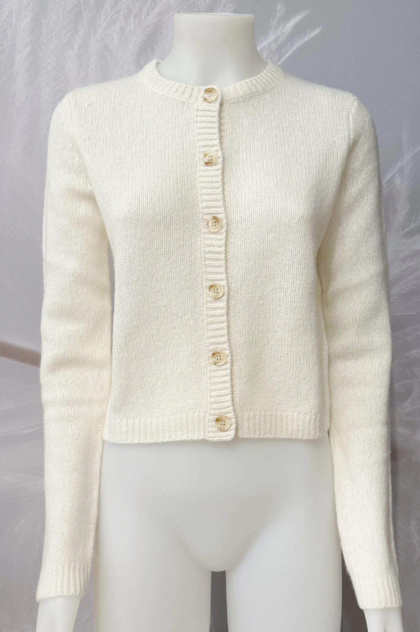 kurz,schmal geschnittenRipp BündchenRundhals AusschnittKnopfleisteFarbe Cream77% Cashmere 23% Seide