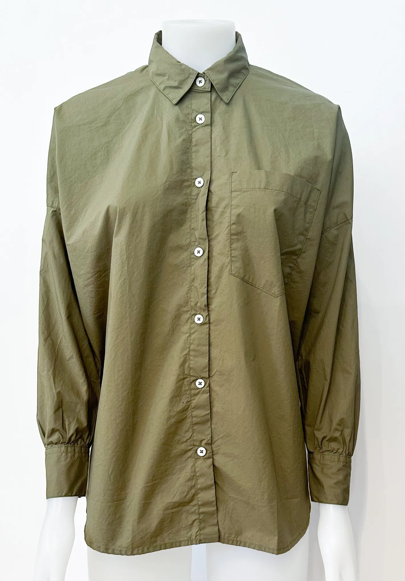 leicht oversize geschnittenHemdblusenkragenüberschnittene SchulterManschettenärmelKnopfleisteeine BrusttascheFarbe Oli…