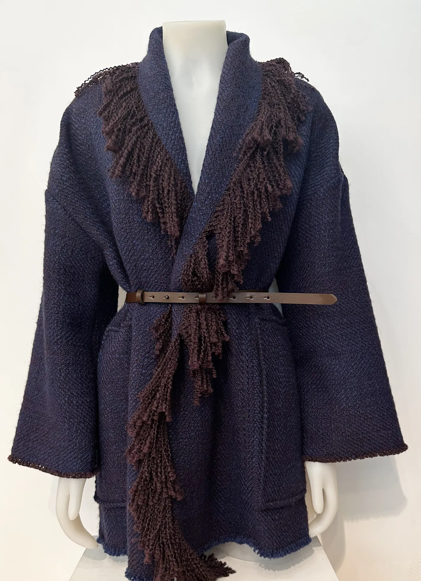 Bouclé Strickoffener Verschlußmit LedergürtelFransenkante2 aufgesetzte TaschenFarbe Navy Braun48% Wolle 43% Acryl 4% …
