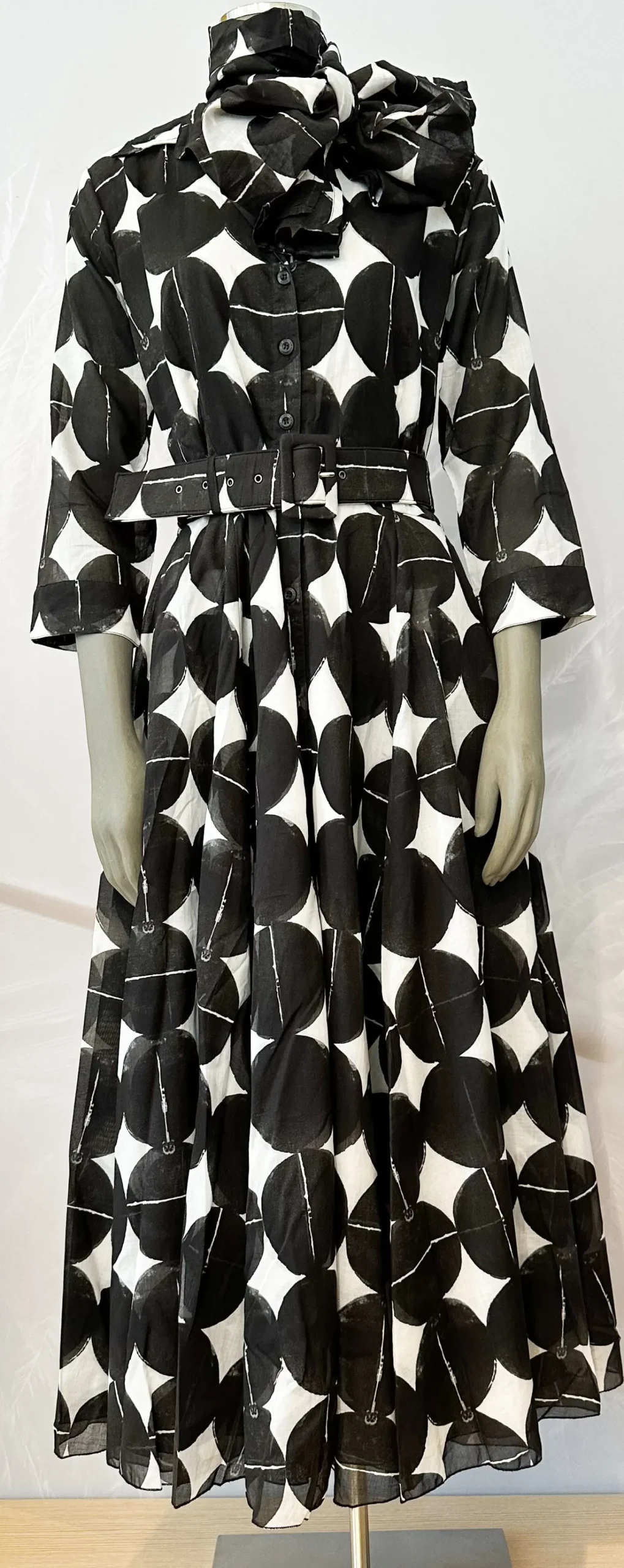 Hemdblusenkleidtailliert mit Gürtelschwingendes Rockteil, gedoppeltdurchgehende KnopfleisteHemdblusenkragen3/4 Arm mit …