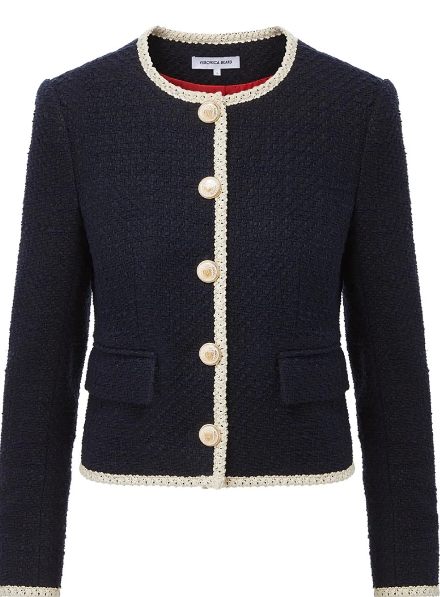 kurz, kastig geschnittenohne KragenSchulterpolsterkontrastreicher BesatzChanel StilSchmuck Metall KnöpfeTweedFarbe Navy…
