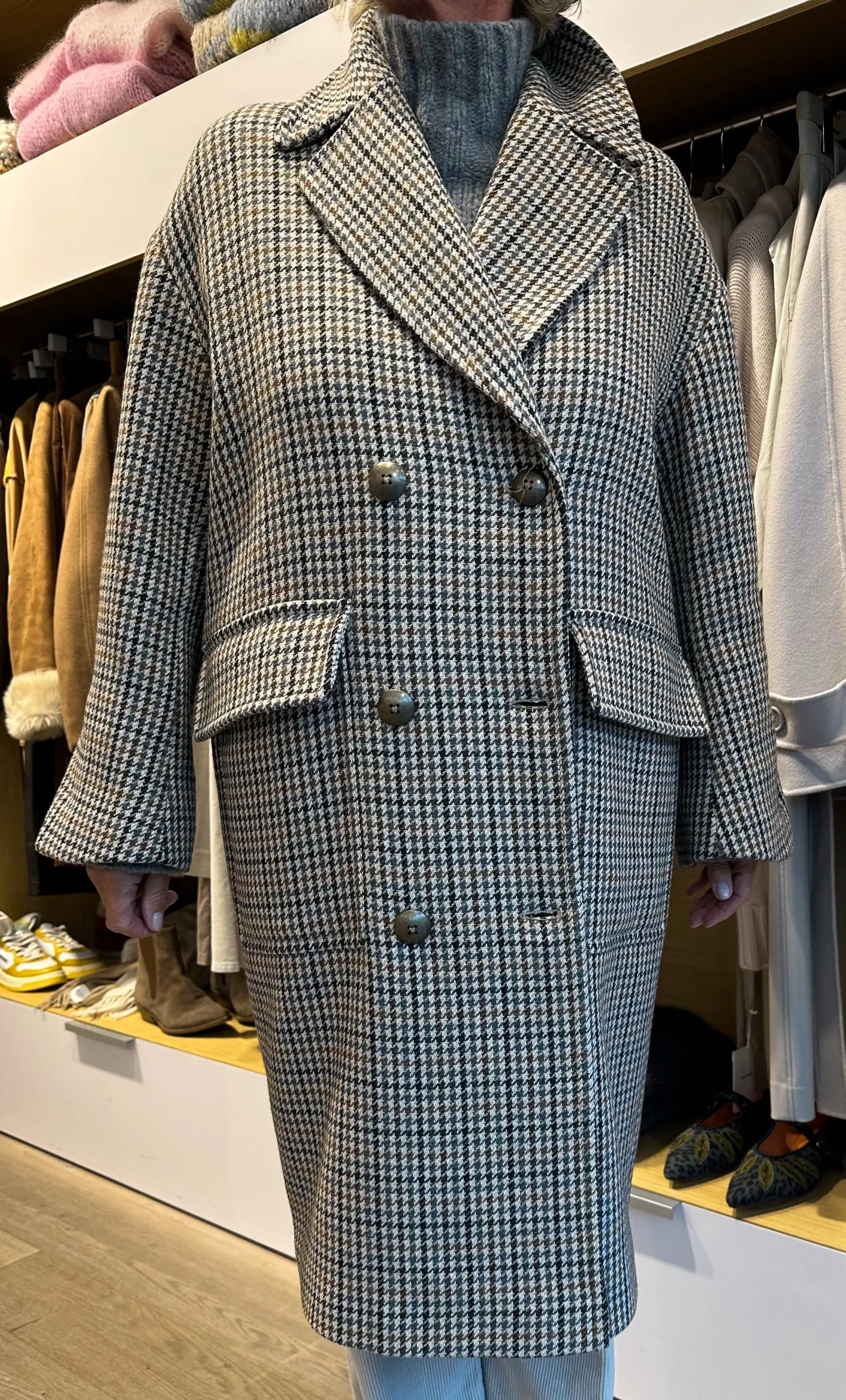 oversize geschnittengroßer Reverskragenzum Saum konisch verlaufendgroße Pattentaschengroße Metall Deko Knöpfeinnen b…