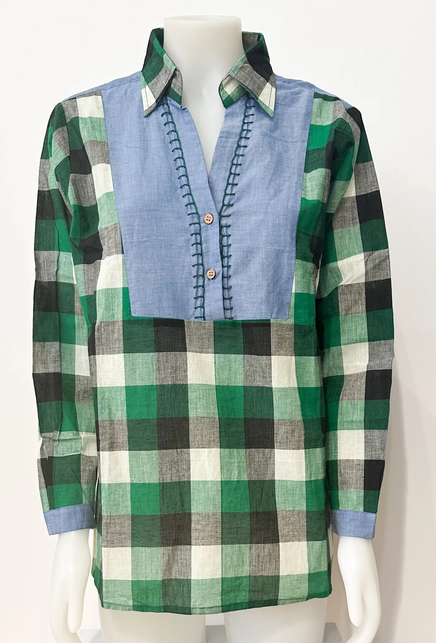 Tunikaformweit schwingendmit HemdbliusenkragenManschettenärmelPatch mit HandstickereiPatch am EllenbogenOnesizeBaumwoll…
