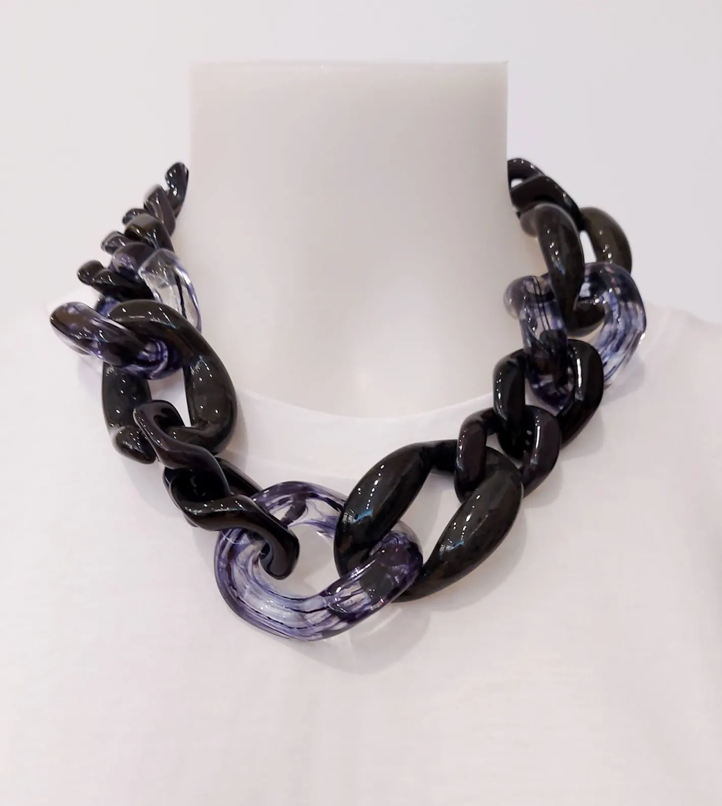 Kurze Kette mit unterschiedlichen Gliedern aus Resina, Kunstharz. Die Kette besteht aus unterschiedlichen Gliedern in den Grössen, Zum Schliessen mit einem runden Karabiner aus Messing vergoldet.