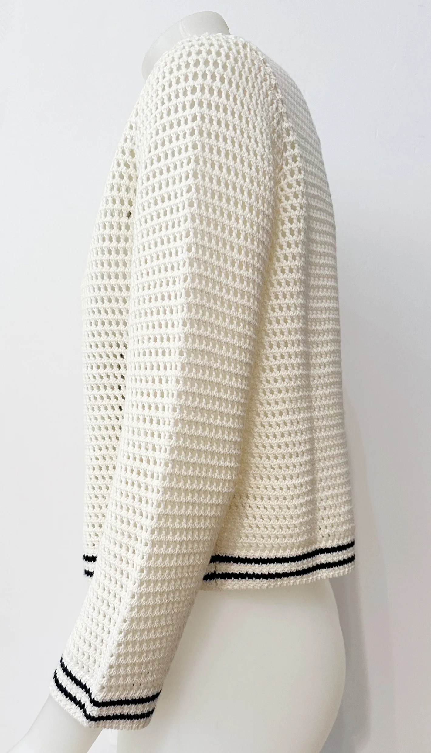 gerade, kurz geschnittenKnopfleisteV-AusschnittLochmusterfarblich abgesetzte BündchenFarbe Creme Navy70% Baumwolle 20% …