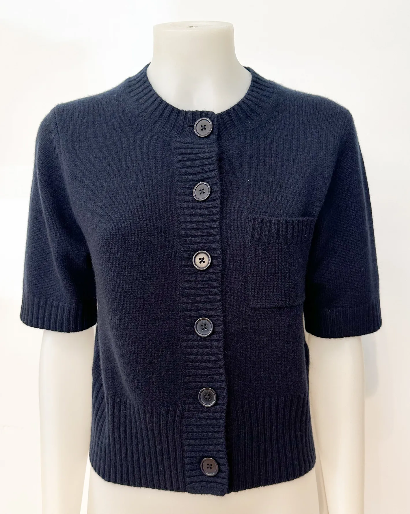 kurzer Cardigan 1/2 Armschmal geschnittenRipp BündchenRundhals Ausschnittkleine BrusttascheFarbe Navy100% Cashmere