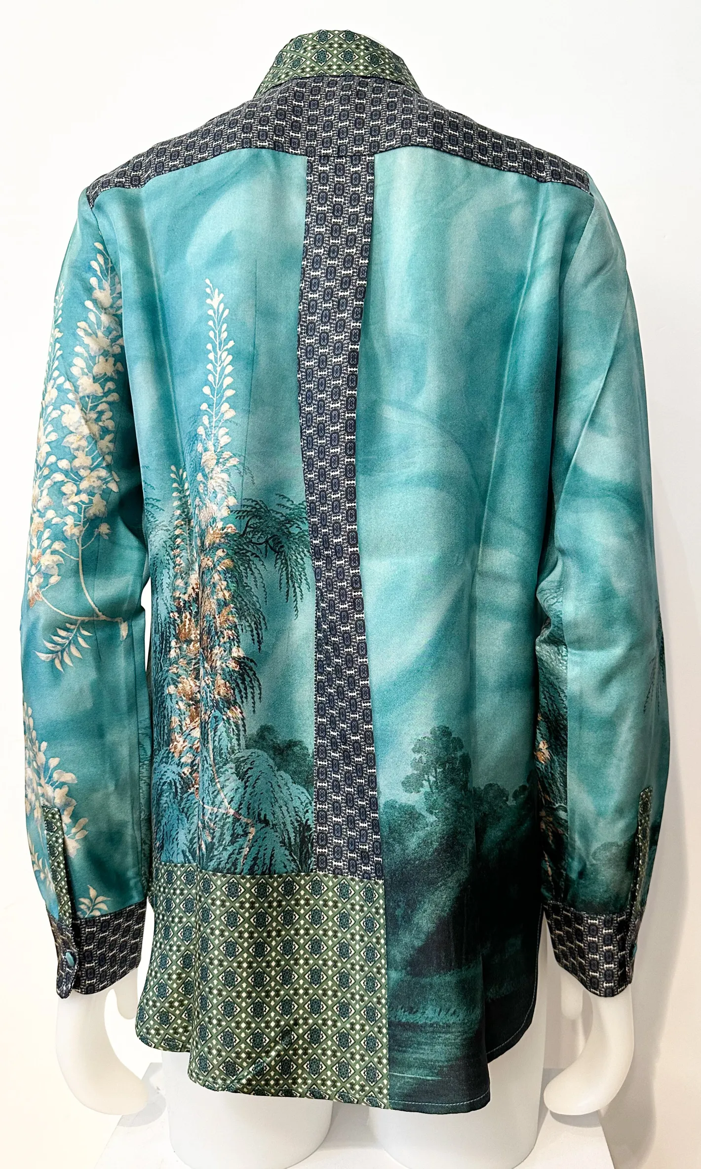 gerade geschnittenHemdblusenkragenManschettenärmelSaum hinten länger, abgerundetüberzogene KnöpfeFarben Türkis/Blau…