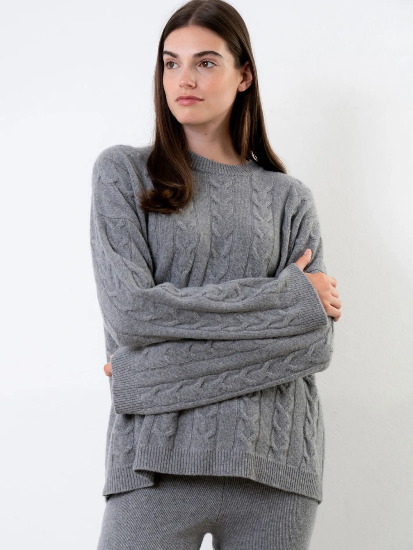 Rundhals Ausschnittgerade geschnittenCable Knit ZopfmusterFarbe Smog / Grau70% Merino Wolle 30% Cashmere