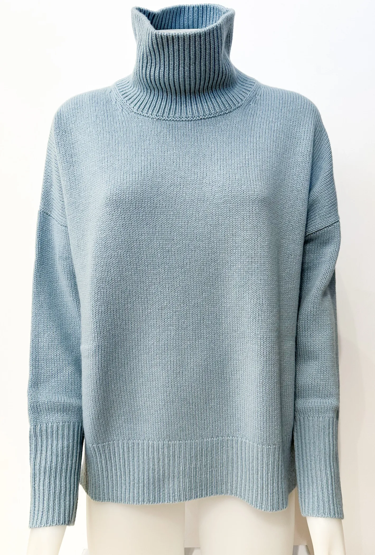 Feinstrick mit RippstrickGerader SchnittRollkragenÜberschnittene SchulternVerlängerte RückenpartieRippbündchen an Ä…