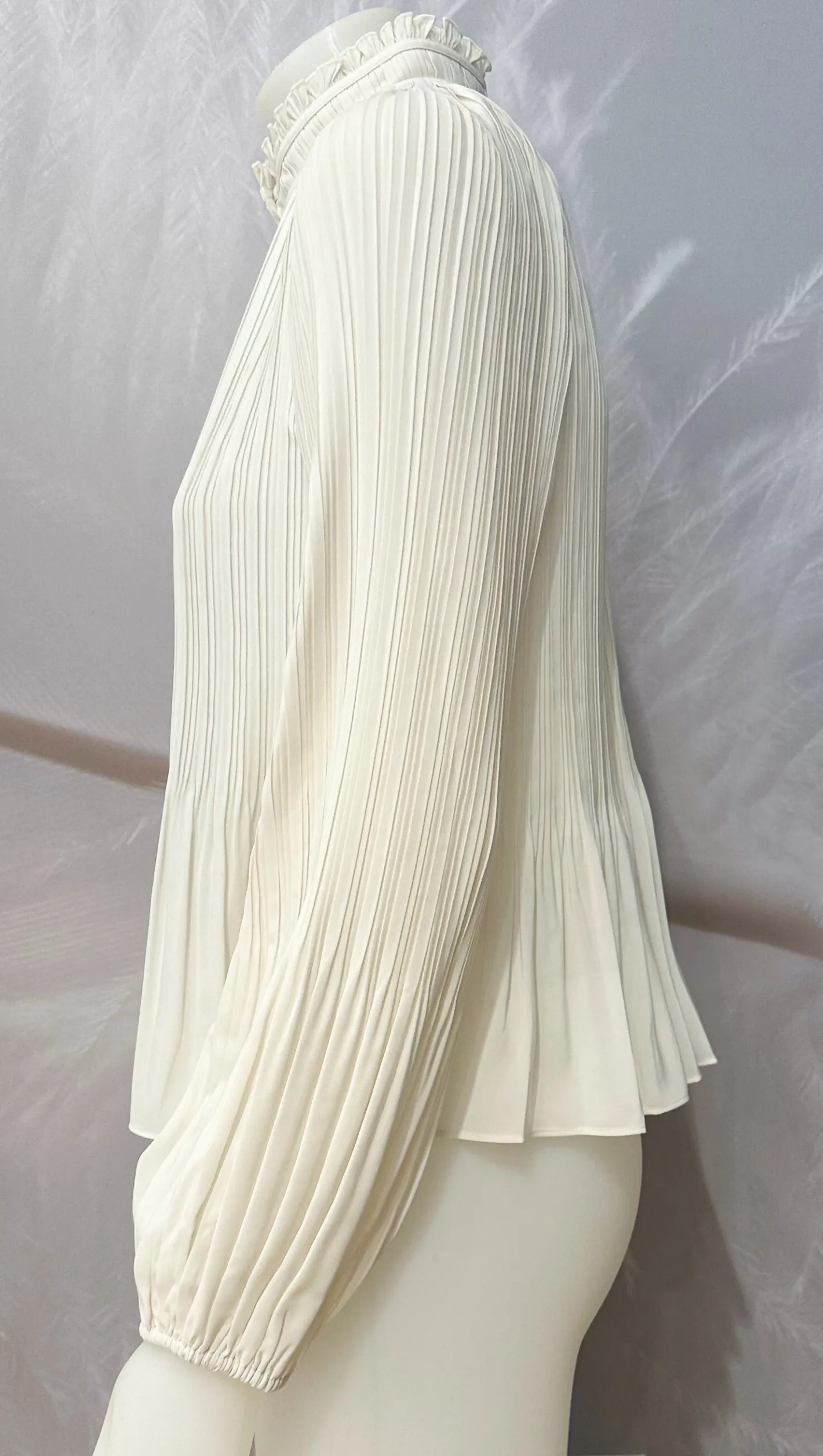 plissierte BluseStehkragen mit Häkchen zu schliessenschwingend zum SaumGummizug am ÄrmelsaumFarbe Ivory100% Polyester