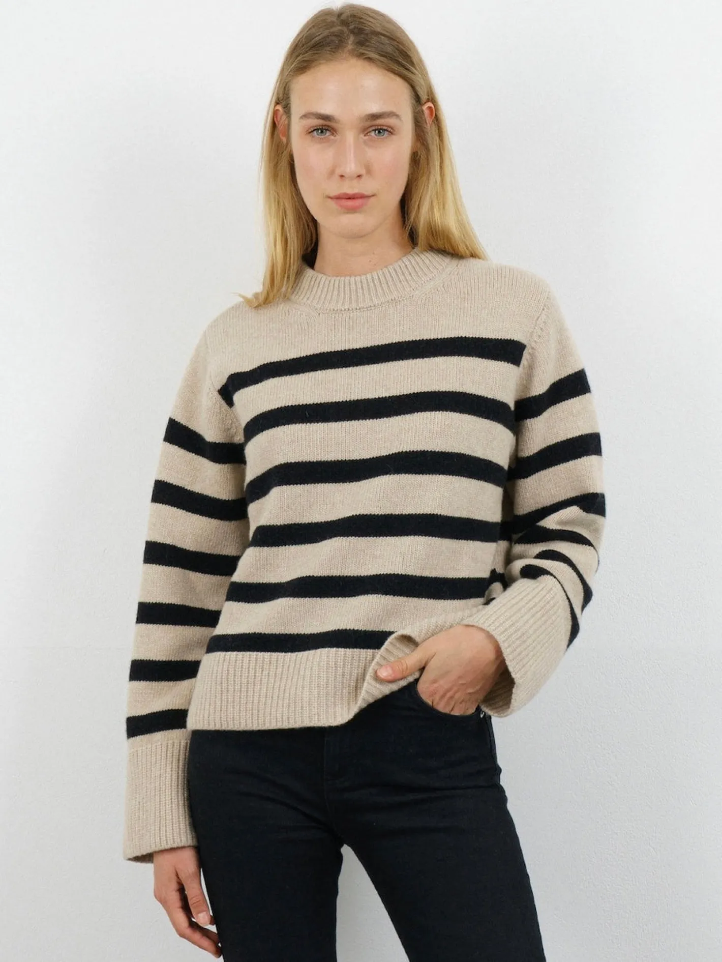 Rundhals AusschnittRipp Bündchengerade geschnittenFarbe Sunday Waffle /Night Beige/Schwarz70% Wolle 30% Cashmere