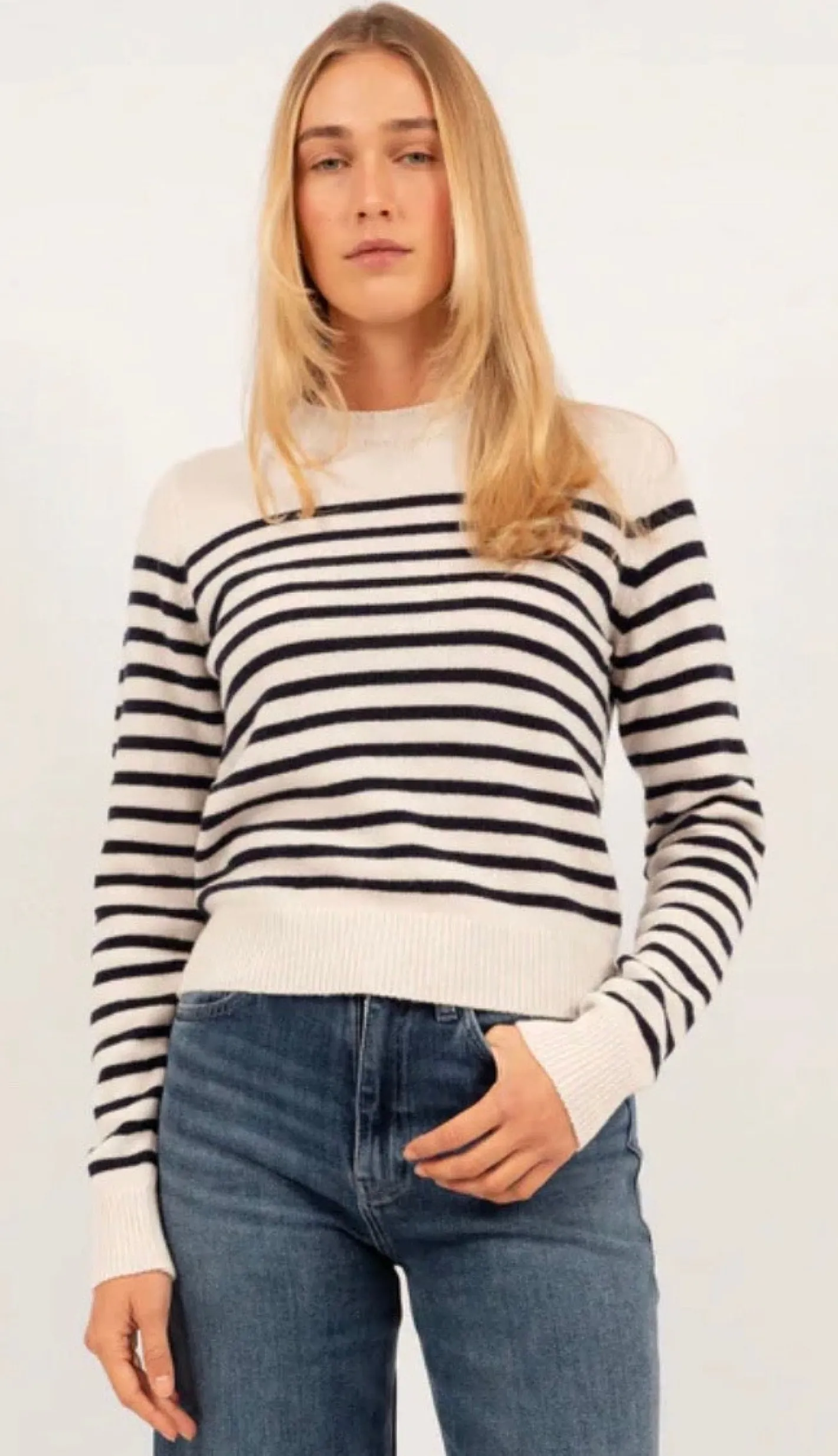 Rundhals Ausschnittgerade geschnittenRipp BündchenFarbe Vanilla / Deep Blue70% Ultrafine Merino Wolle 30% Cashmere