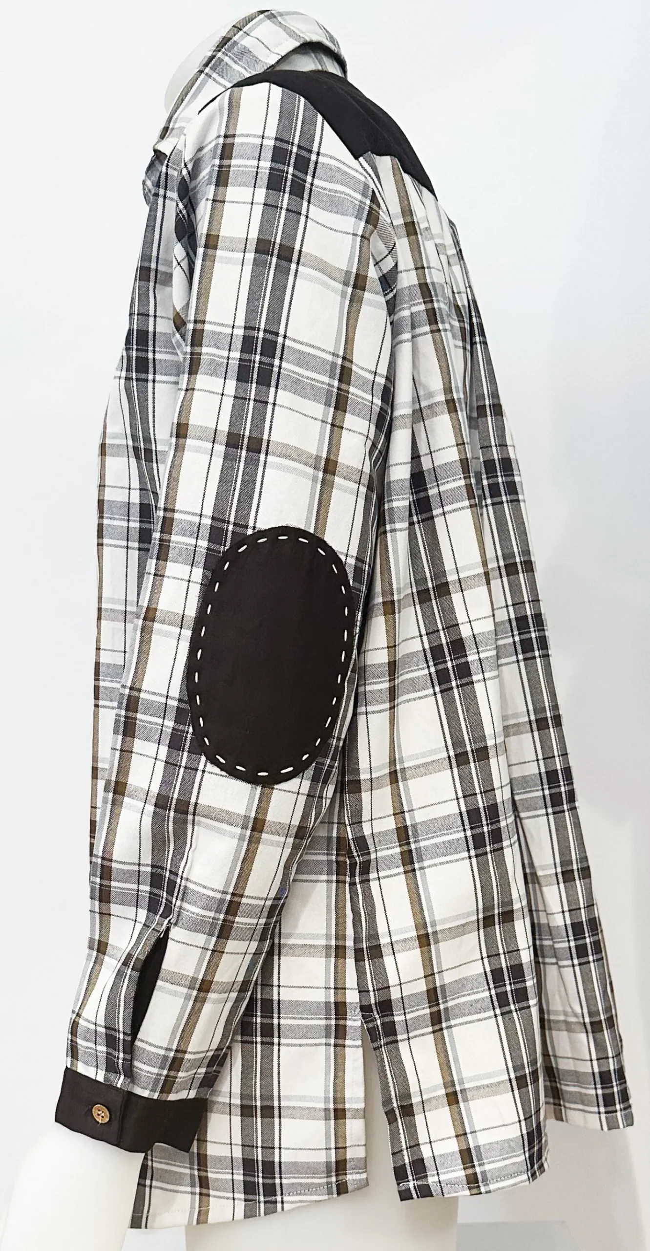 Tunikaformweit schwingendmit HemdbliusenkragenManschettenärmelPatch mit HandstickereiPatch am EllenbogenOnesizeBaumwoll…
