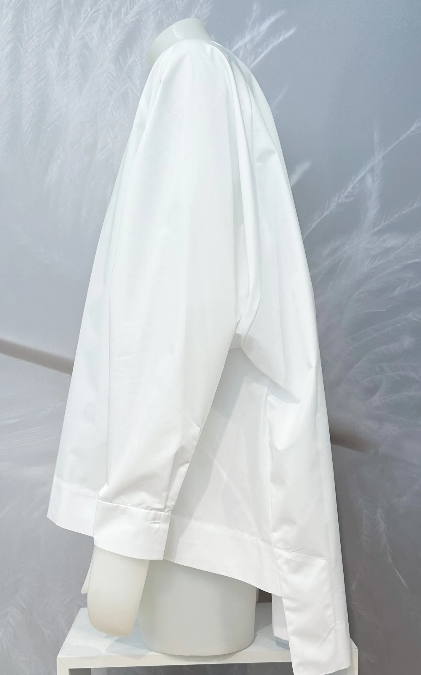 ohne KragenA-Formloose Fitverdeckte Knopfleistehinten länger geschnittenBreiter SaumManschettenärmelFarbe Weiß100% Ba…