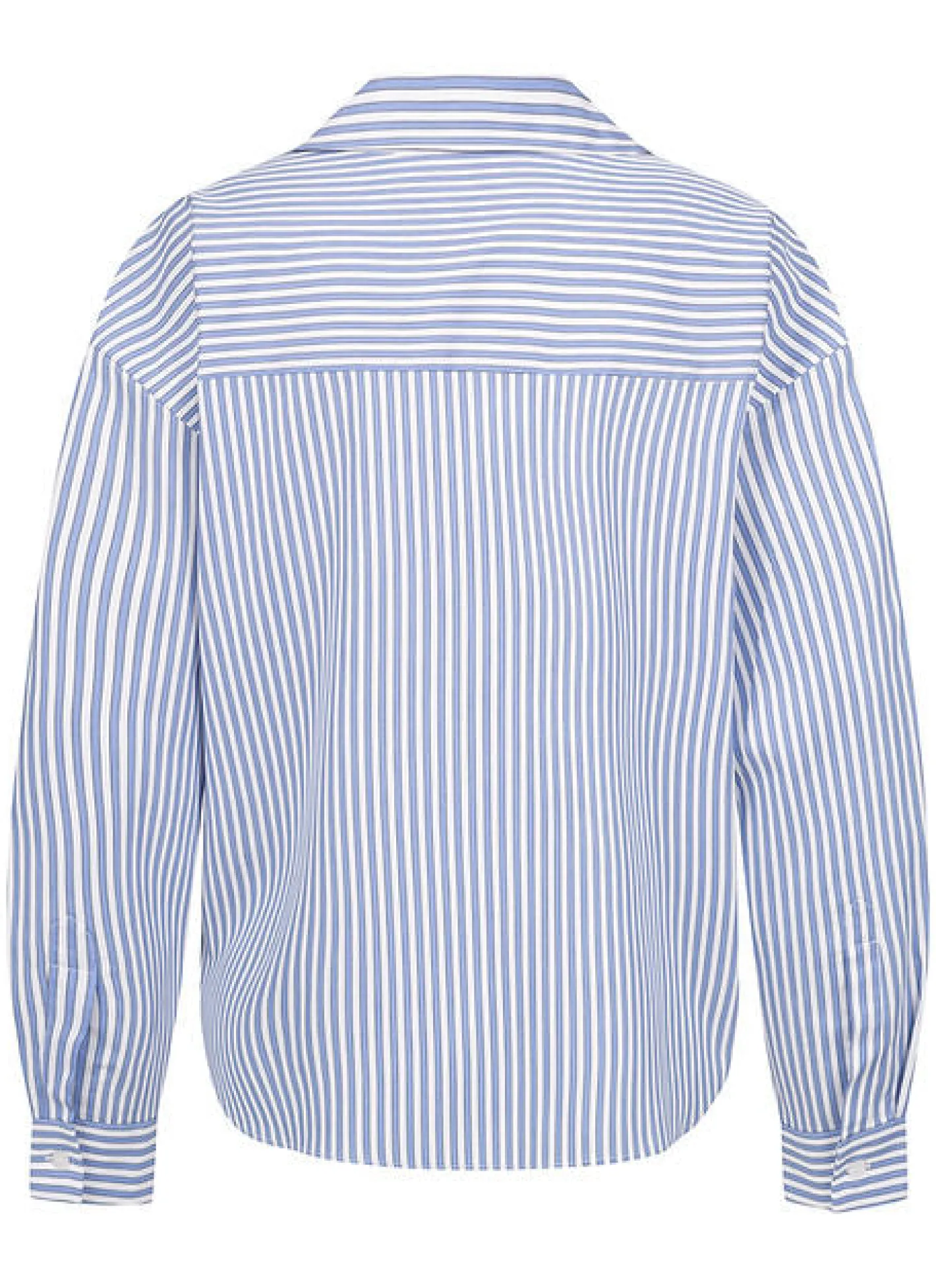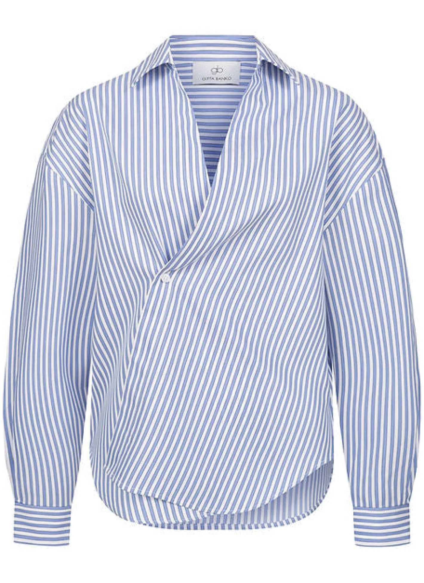 mit einem Knopf schräg zu schließenabgerundeter SaumHemdkragenV-AusschnittFarben Blau Weiß gestreift100% Baumwolle