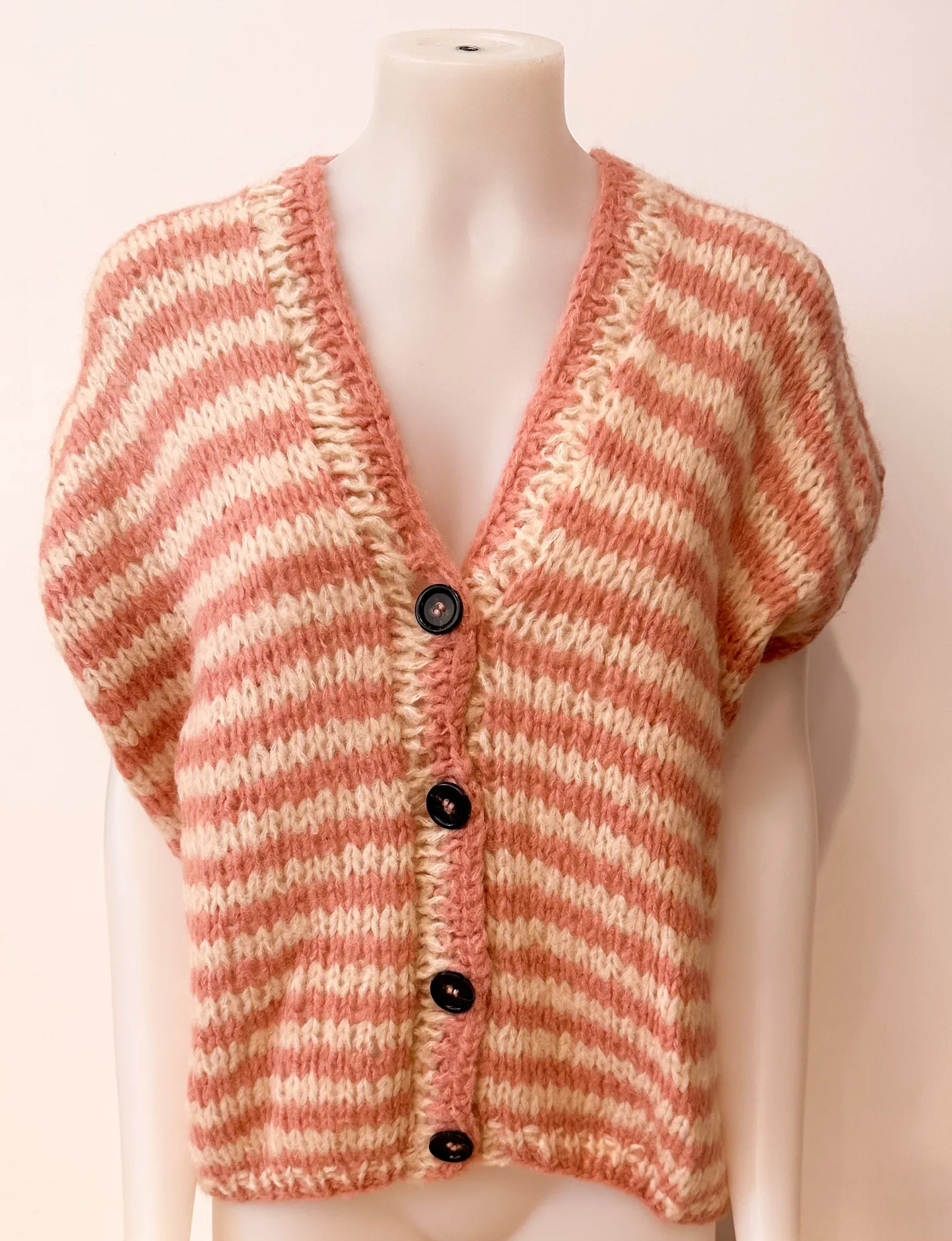 Weste ohne Armweit geschnittentiefer V-AusschnittRingel Creme/RoséOne Size40% Baby Alpaca 30% Cashmere 30% Seide