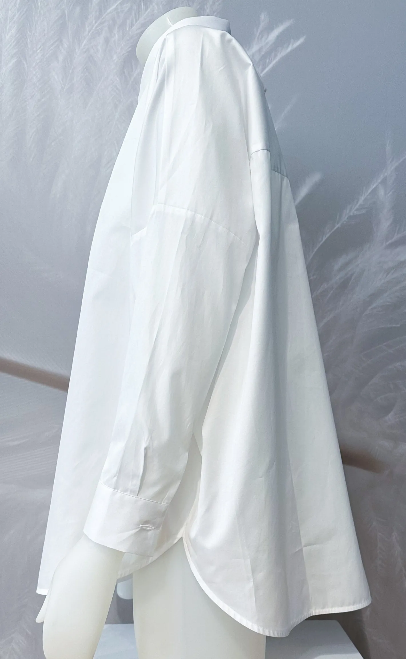 weit, groß geschnittenüberschnittene SchulternHemdblusenkragenManschettenärmelverdeckte KnopfleisteFarbe Weiß100% Ba…
