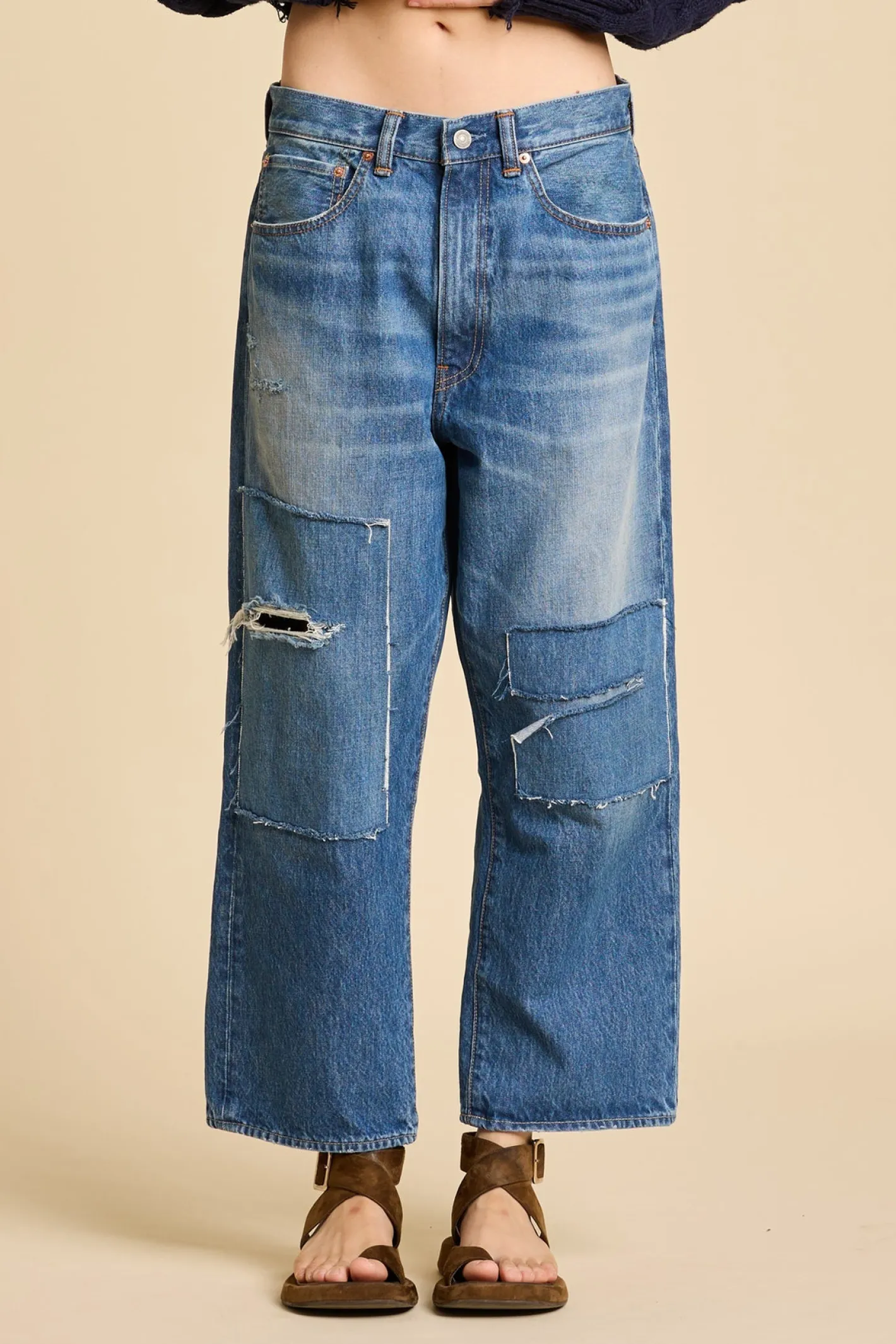 mittlere LeibhöheBoyfriend Stylegerades, verkürztes Beinmit Patches und RipsFarbe/Waschung Apsley Blue100% Baumwolle