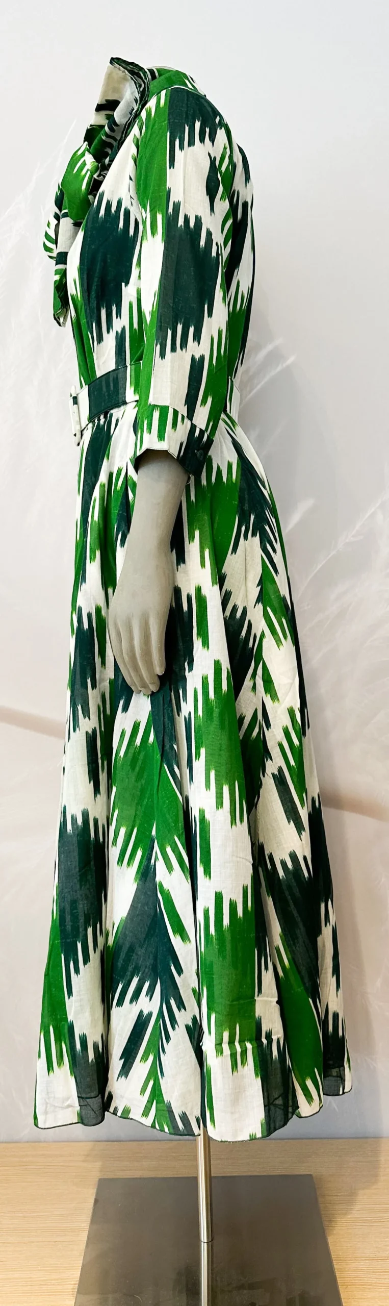 Hemdblusenkleidtailliert mit Gürtelschwingendes Rockteil, gedoppeltdurchgehende KnopfleisteHemdblusenkragen3/4 Arm mit …