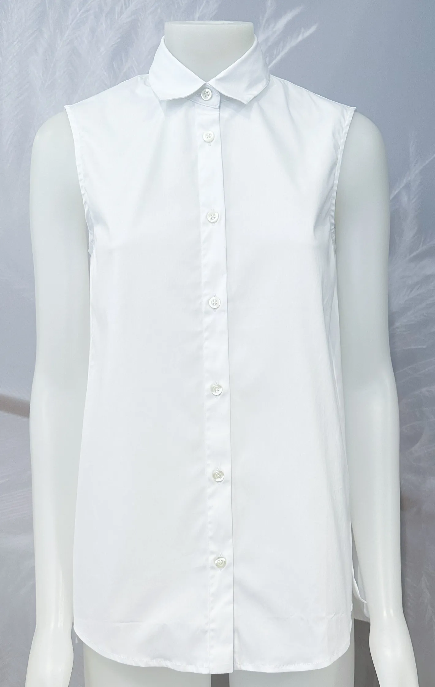 ohne ArmHemdblusenkragenKnopfleisteabgerundeter Saum, hinten längerKellerfalte im Rückenleicht ausgestelltFarbe Weiß7…