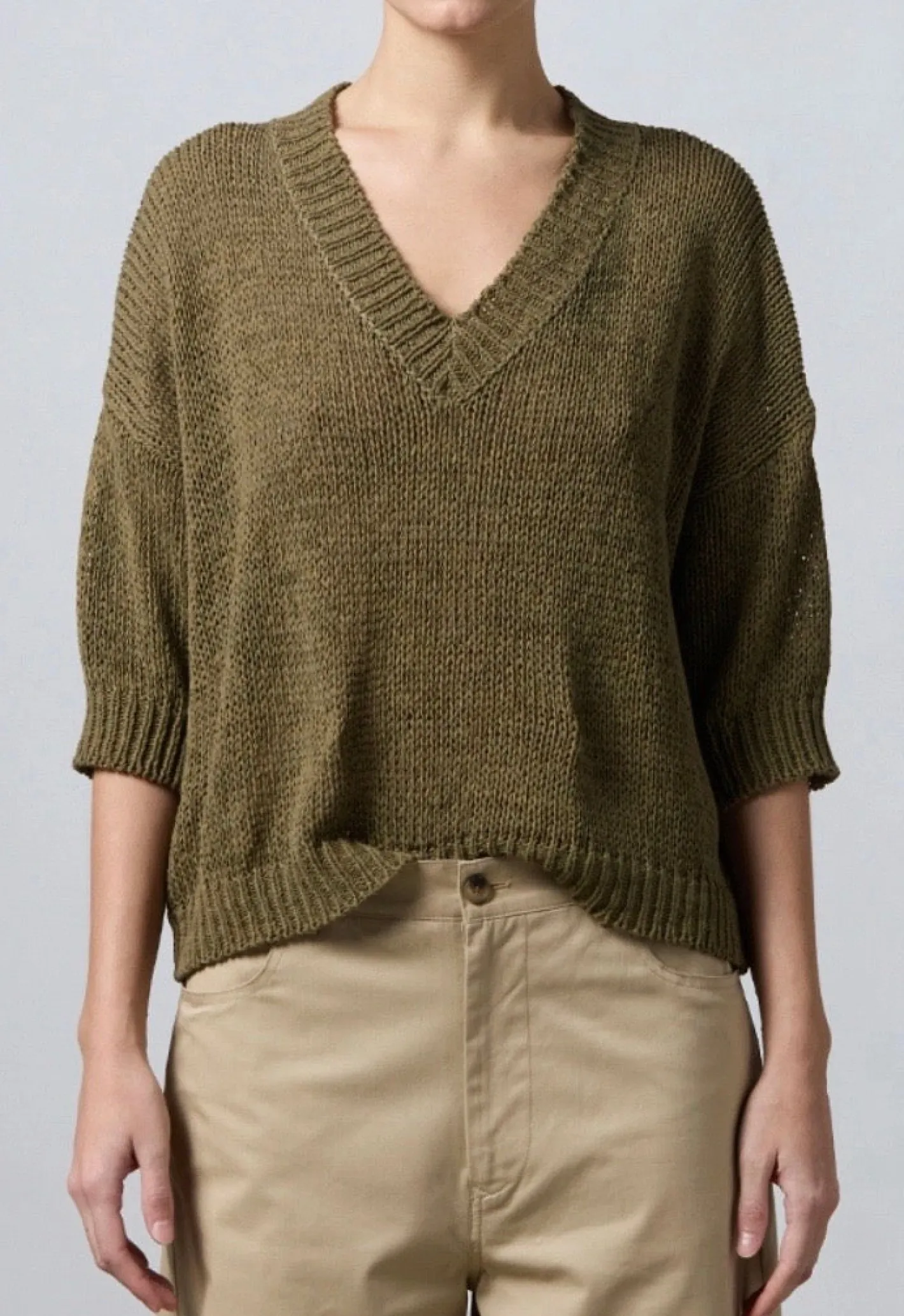 Boxy V-Neckloose FitRipp Bündchen3/4 ArmSommer StrickFarbe Military66% Baumwolle 34% Polyamid