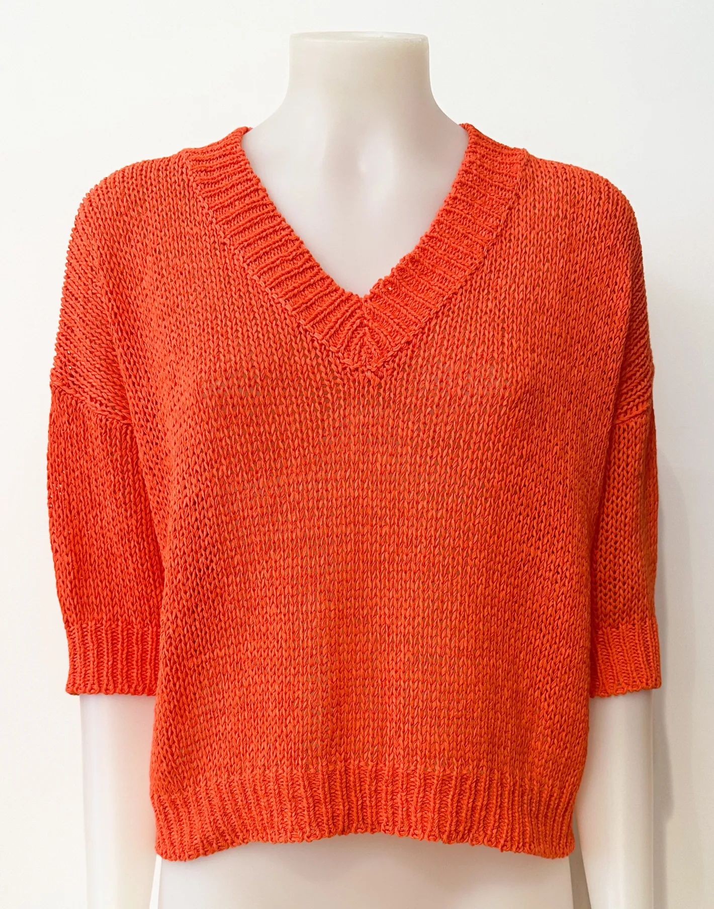 Boxy V-Neckloose FitRipp Bündchen3/4 ArmSommer StrickFarbe Coralle66% Baumwolle 34% Polyamid