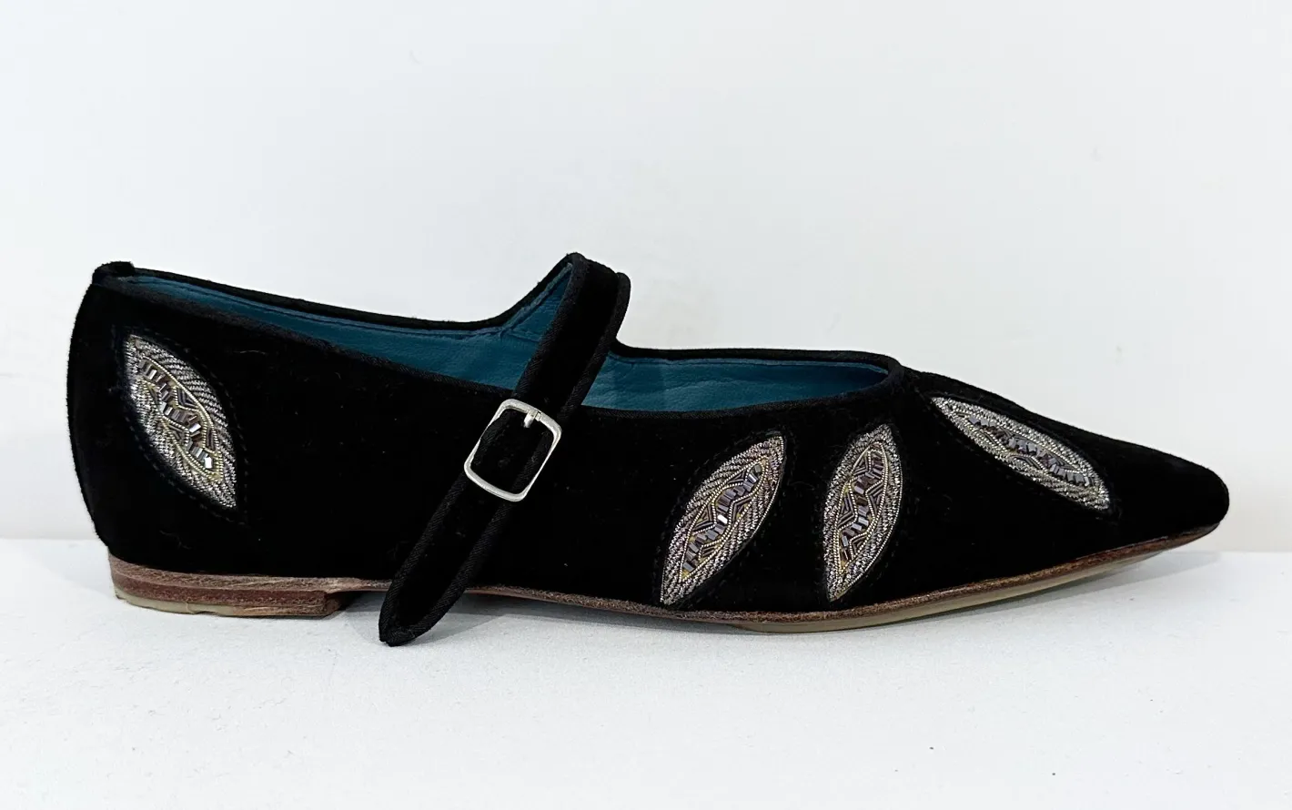 spitzer Ballerinamit Fesselriemchen zum VerstellenSohle halb Leder, halb Gummimit StickereiFarbe SchwarzLeder