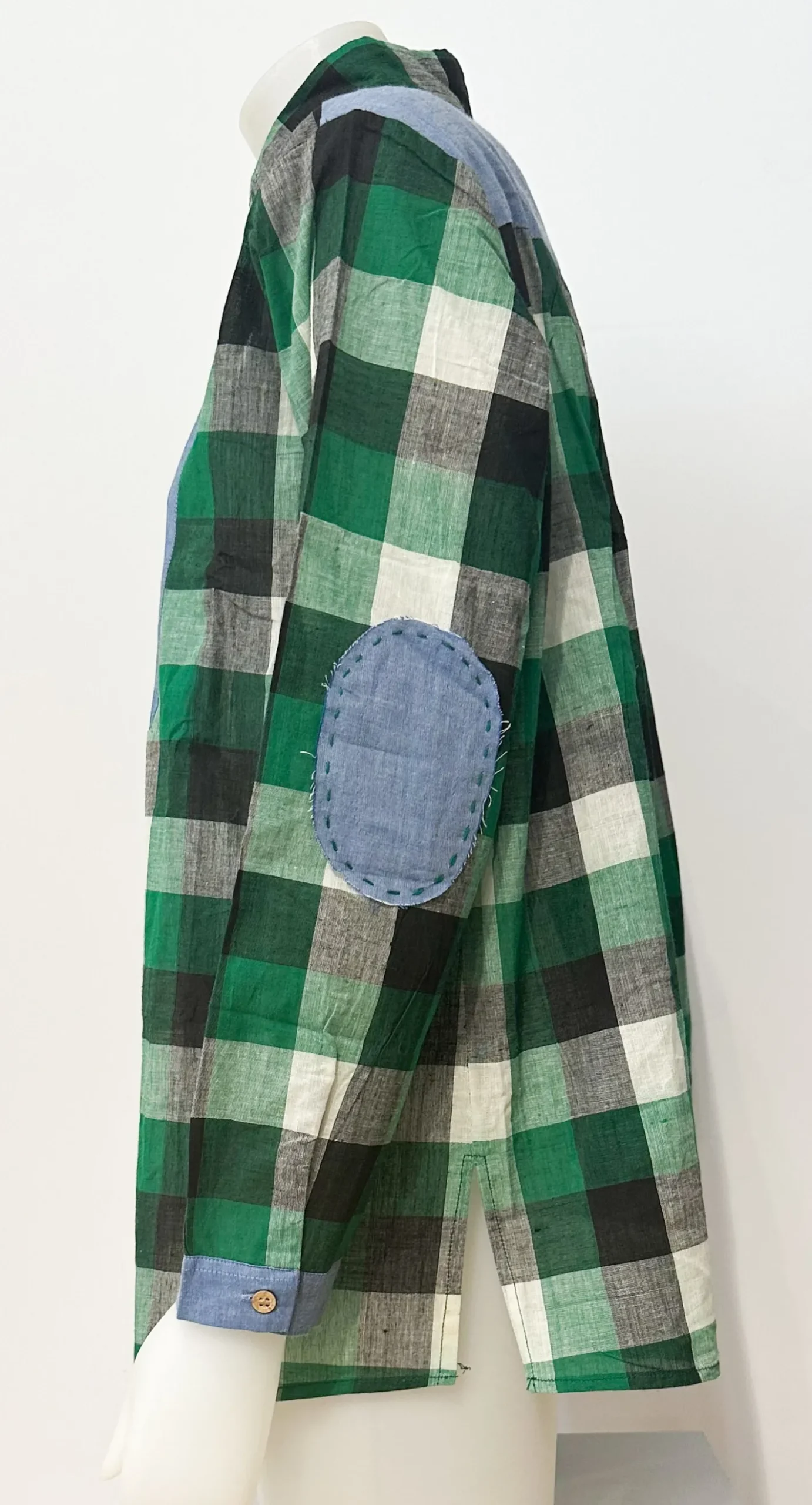 Tunikaformweit schwingendmit HemdbliusenkragenManschettenärmelPatch mit HandstickereiPatch am EllenbogenOnesizeBaumwoll…