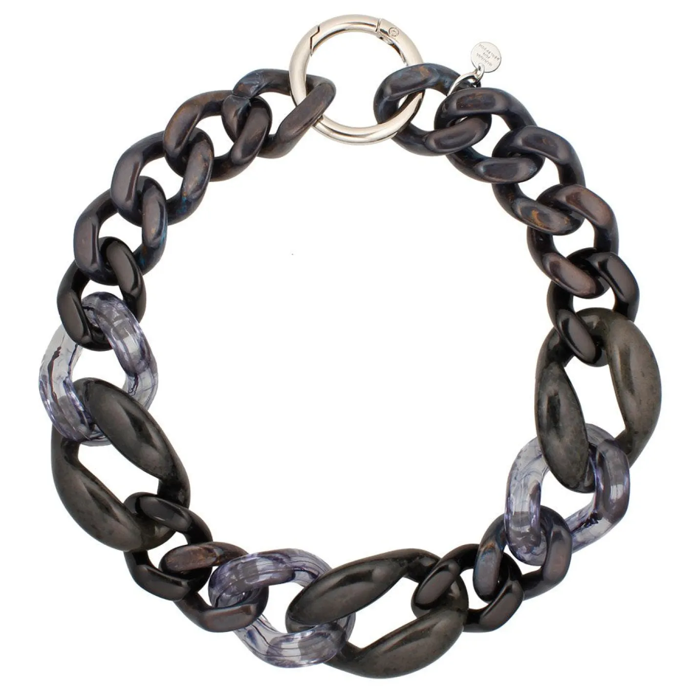 Kurze Kette mit unterschiedlichen Gliedern aus Resina, Kunstharz. Die Kette besteht aus unterschiedlichen Gliedern in den Grössen, Zum Schliessen mit einem runden Karabiner aus Messing vergoldet.