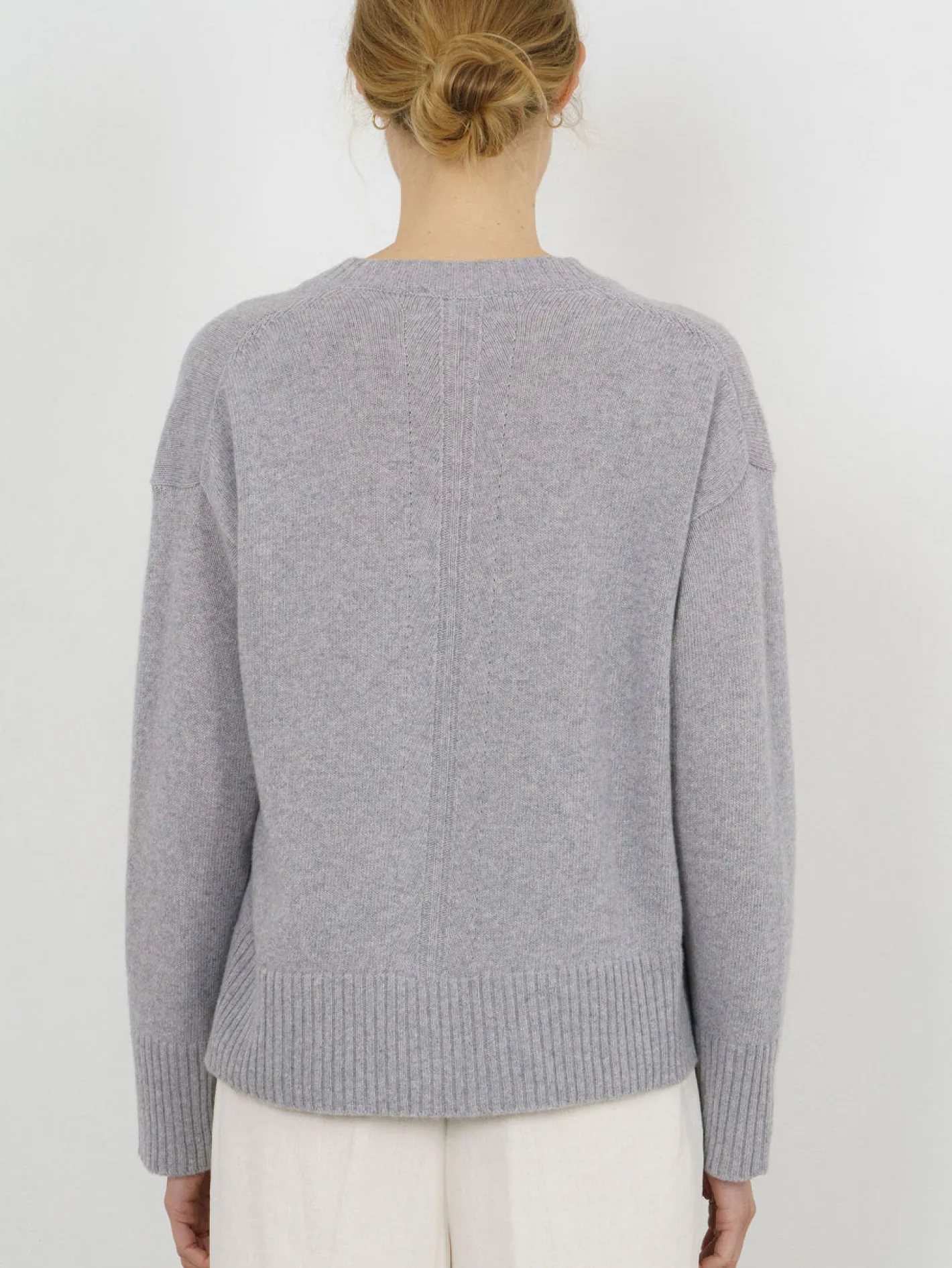 V-Ausschnittgerade geschnitten Ripp BündchenFarbe Oyster Grey70% Merino 30§ Cashmere