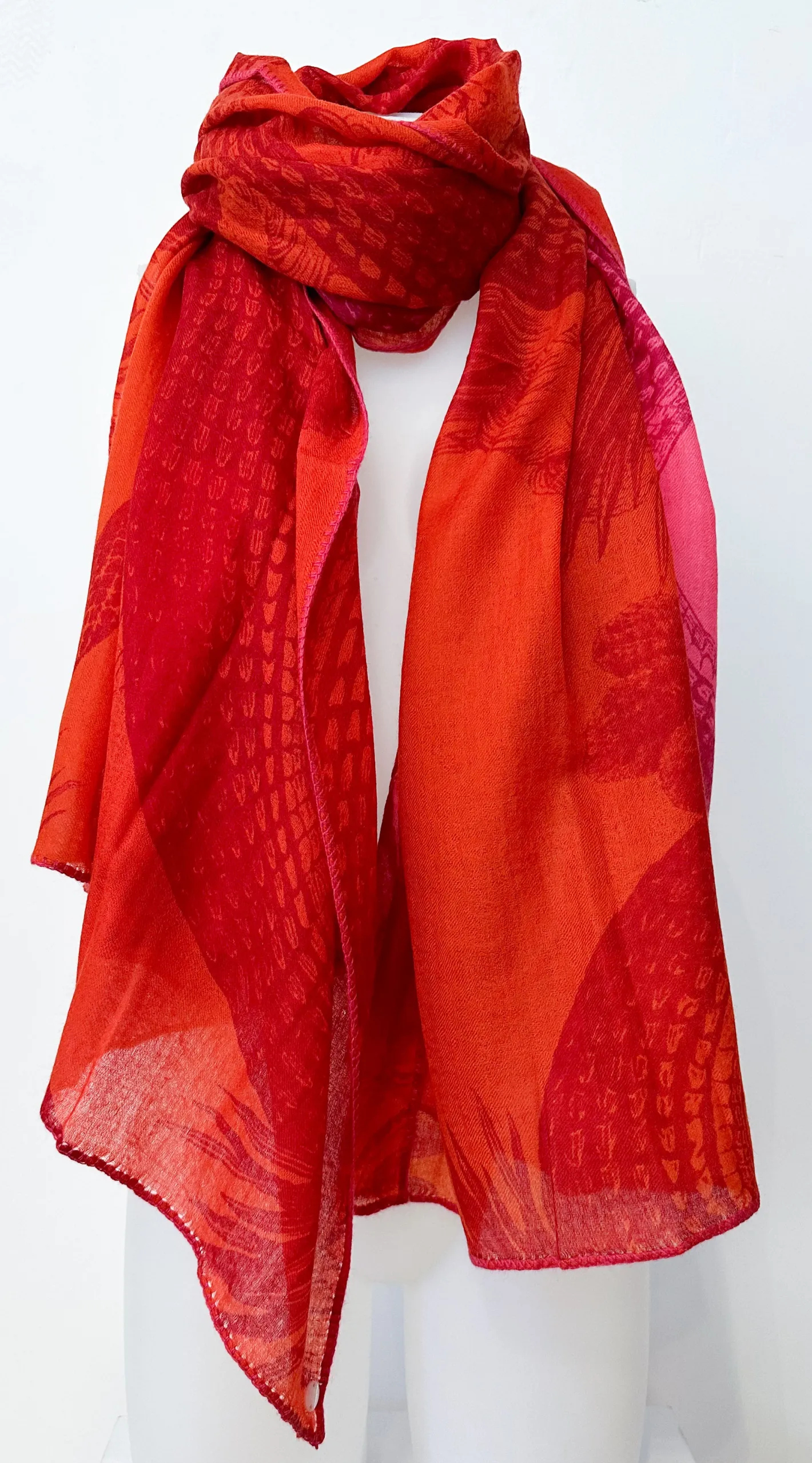 Der friendly hunting Scarf Patch wird per Hand in der Manufaktur in Nepal aus 100% Cashmere in drei einzelne Teile gewebt und anschließend gefilzt. Seine dichte Struktur mildert die Empfindlichkeit dieses fragilen Materials. Die Einzelstücke werden anschließend individuell gefärbt und Ihre Prints im Handsiebdruck platziert. Zuletzt werden sowohl die drei Teile zu einem Schal als auch die Außenränder zur Verzierung gehäkelt.