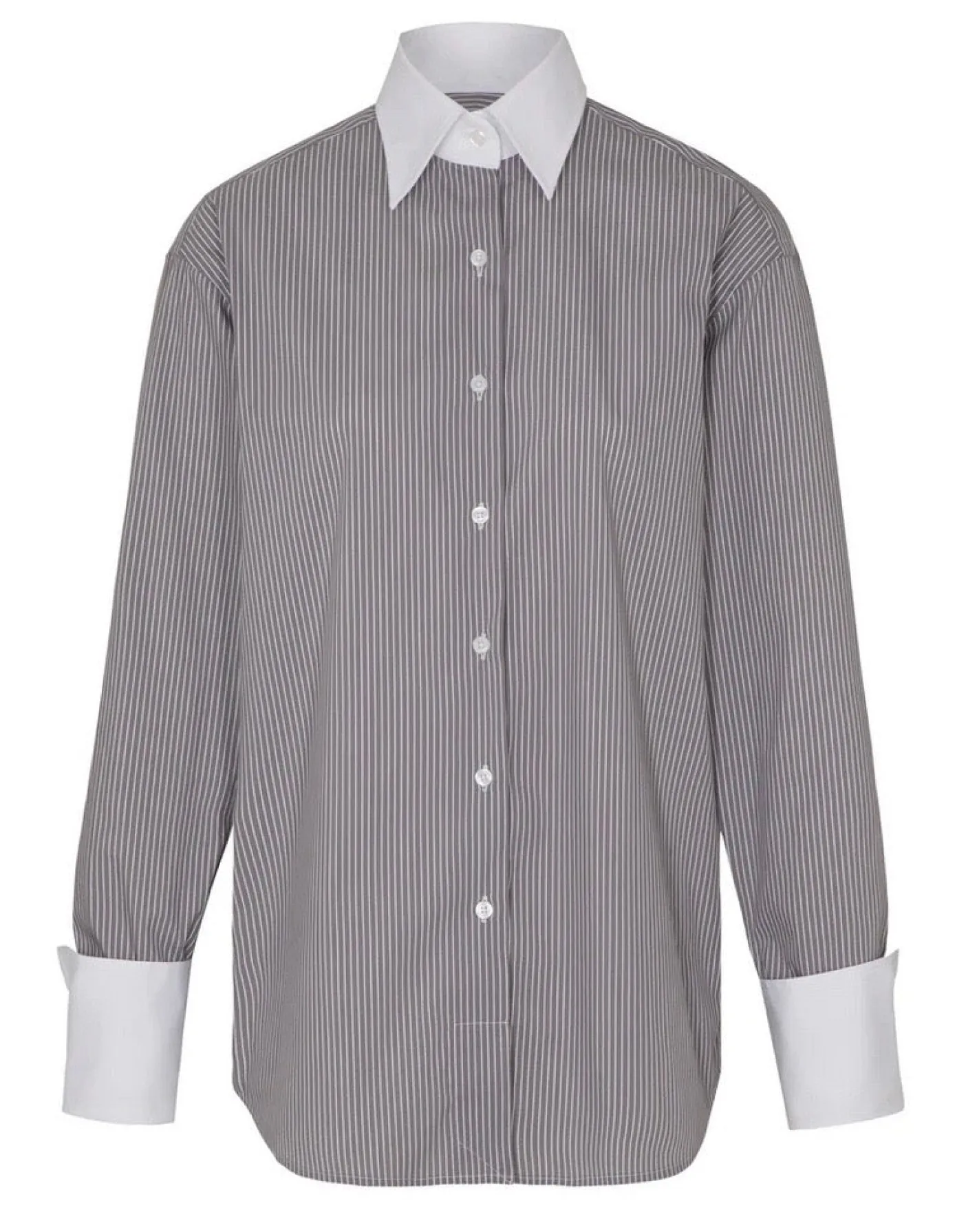 weißer abgesetzter Kragen und lange weiße Manschetten zum UmschlagenKnopfleiste leicht oversize geschnittenFarbe Grey…