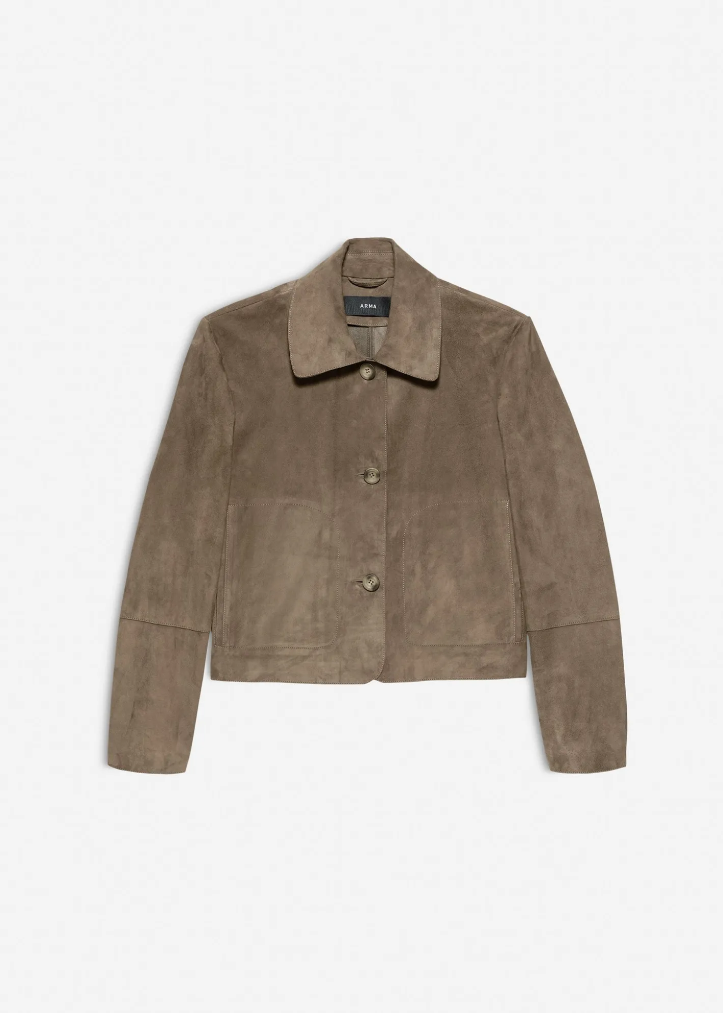 kurz und gerade geschnittenseitliche EingriffstaschenKnopfleisteungefüttertUmlegekragenFarbe Soil100% Ziegen Velourlede…