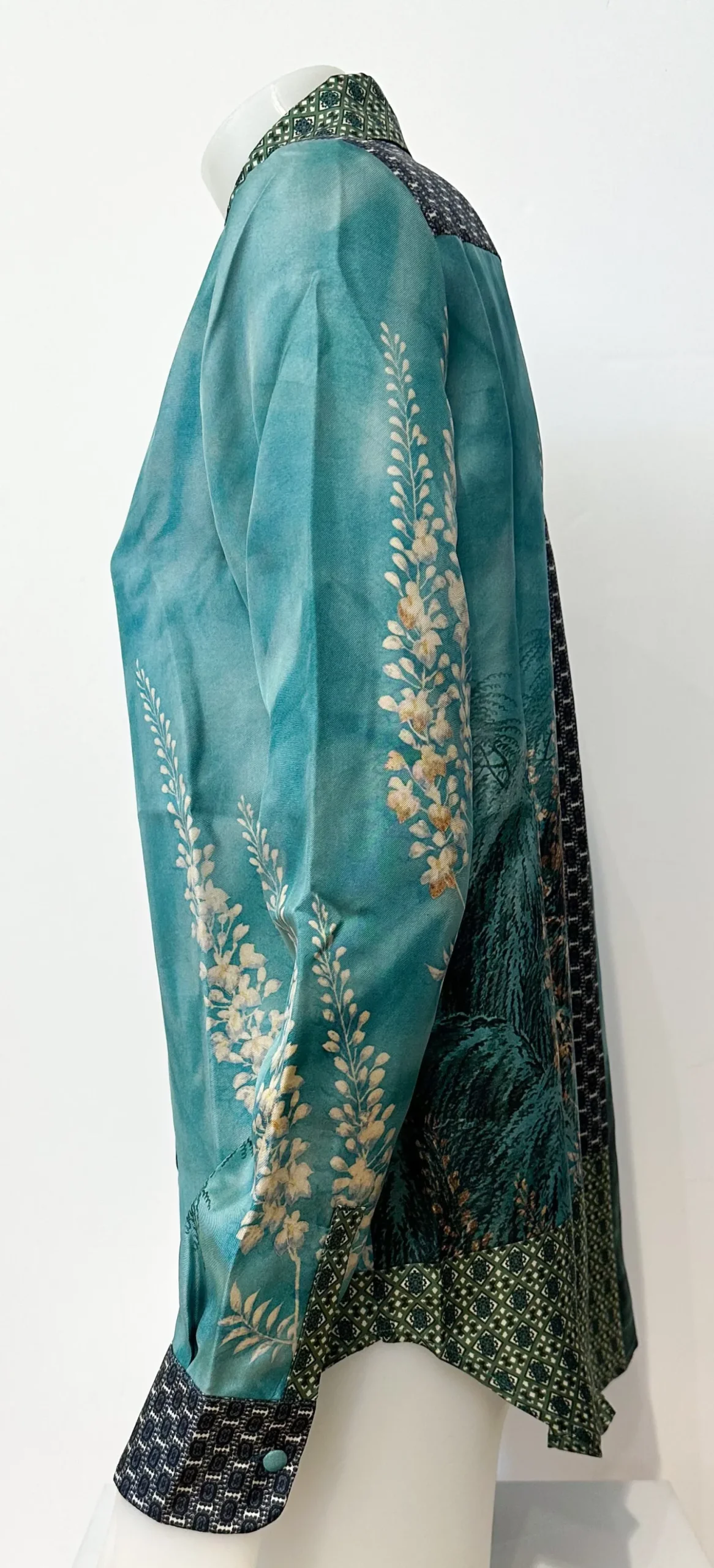 gerade geschnittenHemdblusenkragenManschettenärmelSaum hinten länger, abgerundetüberzogene KnöpfeFarben Türkis/Blau…