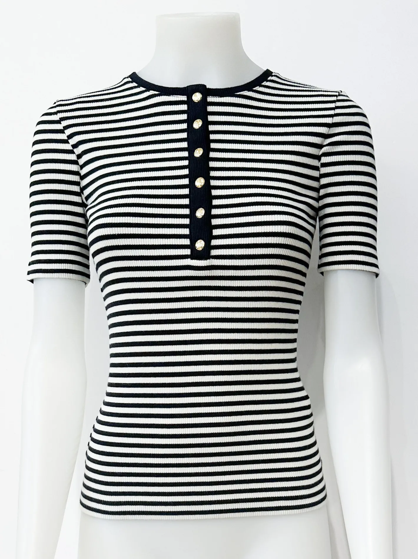 schmales Halbarm ShirtRippeKnopfleiste mit GoldknöpfenFarbe Cream und Schwarz gestreift95% Baumwolle 5% Spandex