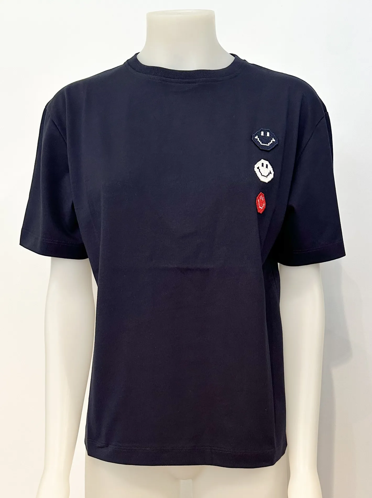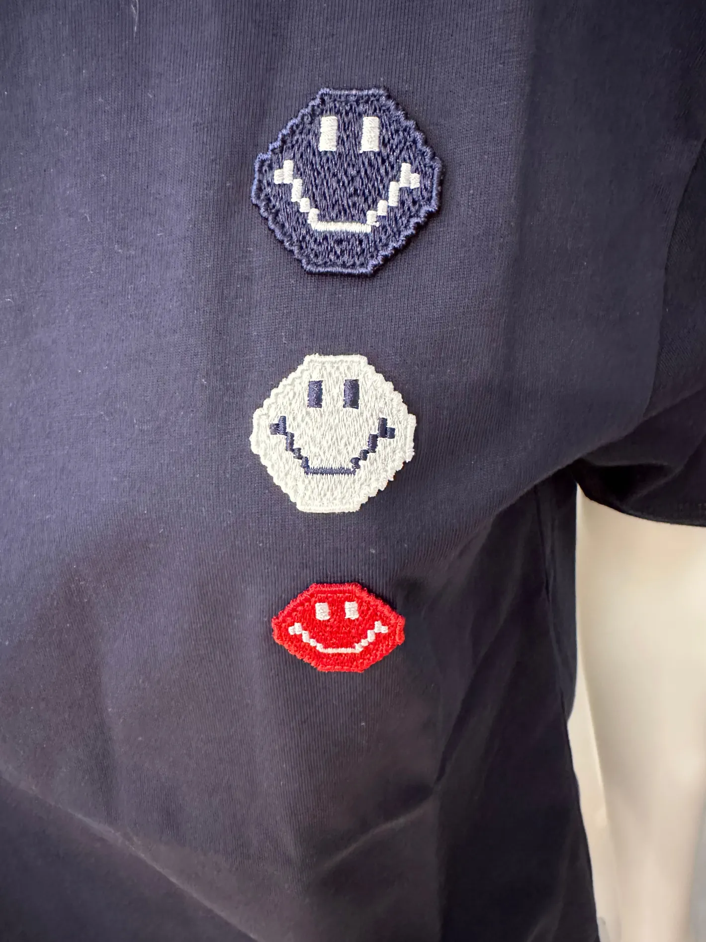T-ShirtBasic SchnittRundhals AusschnittSmiley Patches Blau Weiß RotSchrift hintenFabe Navy100% Baumwolle