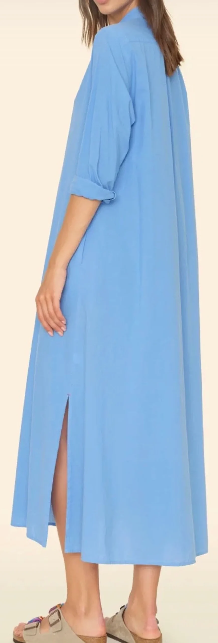 langes Kleid, tailliertKnopfleisteHemdblusenkragenseitliche Schlitzeseitliche NahttaschenFarbe Pond100% Baumwoll Popelin…